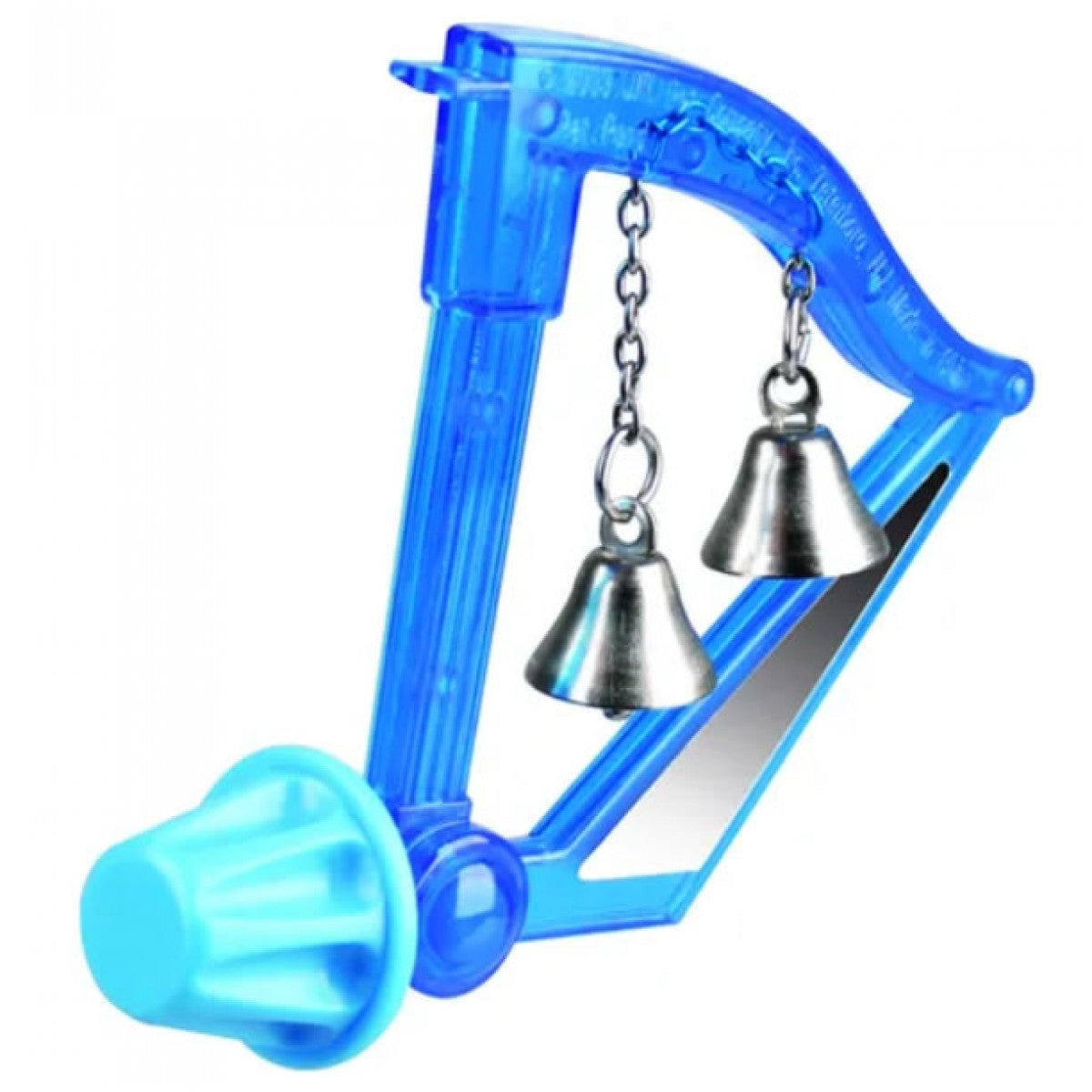 Juguete para exóticos: diamantes, periquitos o agapornis de plástico en forma musical de arpa, con aplique para sujetar bien en los barrotes de la jaula, contiene dos campanas de metal.