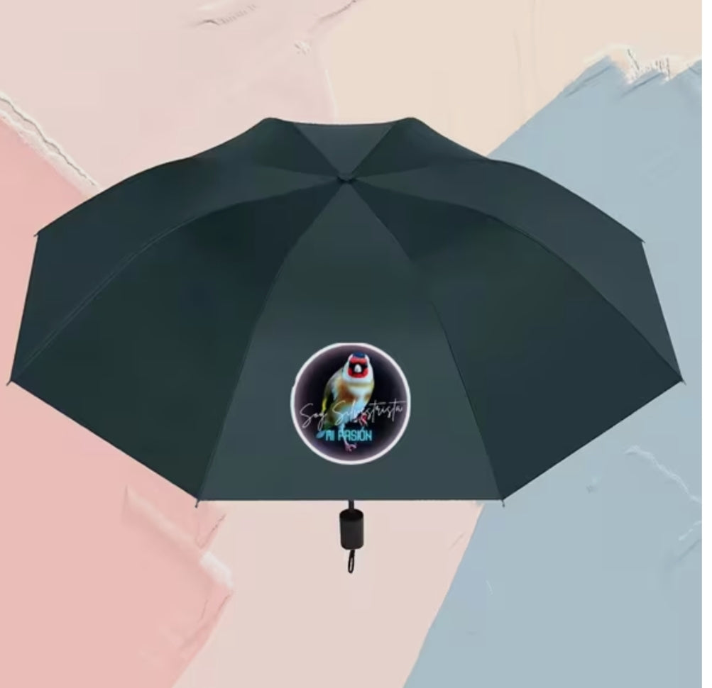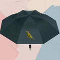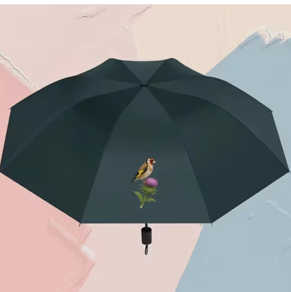 Paraguas de mano verde con estampación de jilguero con manillar de plástico.